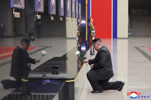 在欢迎仪式与欢迎演出之间,金正恩前往四·二五文化会馆中央大厅,向追悼墙上的9名工兵团阵亡官兵致哀、授勋。其程序,与8月举行的“表彰朝鲜人民军海外作战部队指战员的国家授奖仪式”类似。